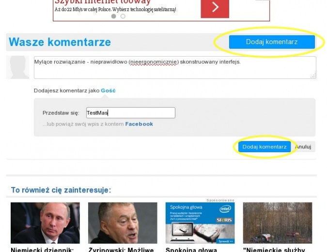 Miary dopełnia interfejs dodawania komentarzy, nieprzemyślany i mylący. Dwa, różniące się wyłącznie rozmiarem, przyciski o zupełnie różnych funkcjach. Na dodatek kliknięcie jednego z nich powoduje utratę wpisanego komentarza…