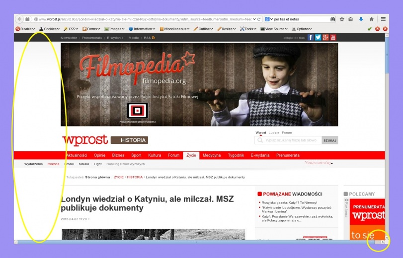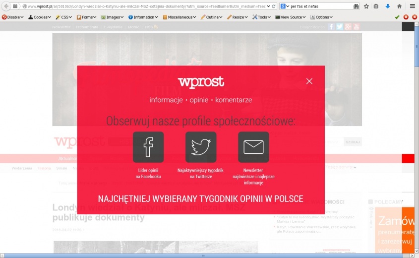 Nie dość, że strona wita nas nachalnie zasłaniającą zawartość, stręczącą serwisy społecznościowe plakietką, to jeszcze ta plakietka nie jest wycentrowana, tylko przesunięta w lewo (zrzuty ekranu - obok).