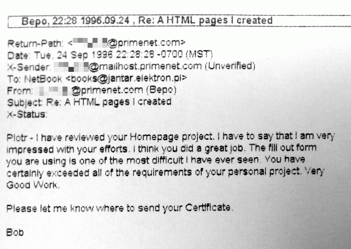 W połowie lat 90 założyłem jedną z pierwszych polskich księgarń internetowych „NetBook”. Książki i oprogramowanie zamawiali głównie Rodacy z zagranicy. Przedsięwzięcie przynosiło więcej satysfakcji niż dochodów, ale dawało okazję do spędzania czasu w Sieci, poznawania jej technicznych i socjologicznych tajników. Równolegle w swoich zainteresowaniach programistycznych zacząłem odchodzić od popularnego wówczas, bazodanowego Clippera ku technologiom bardziej związanym z Internetem.